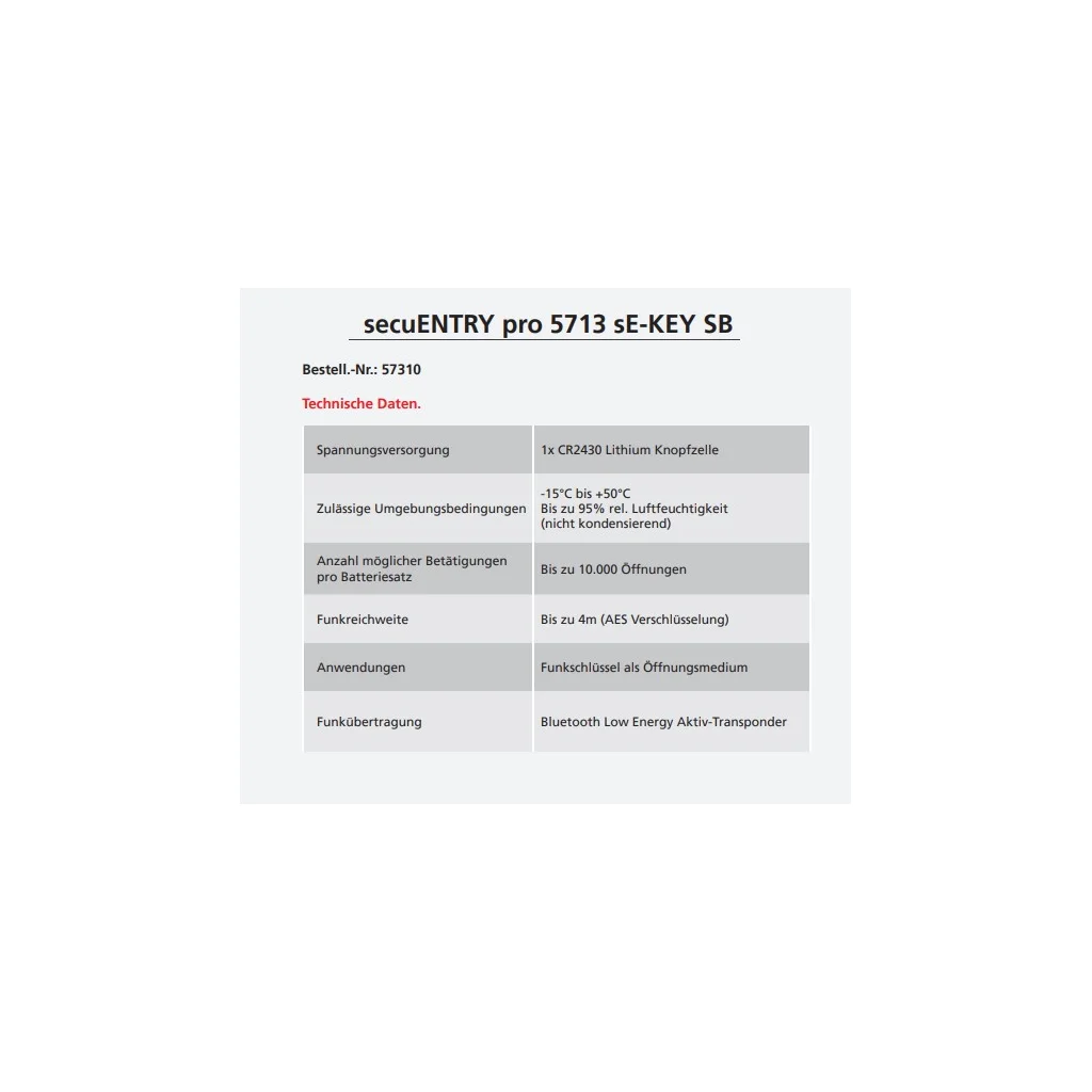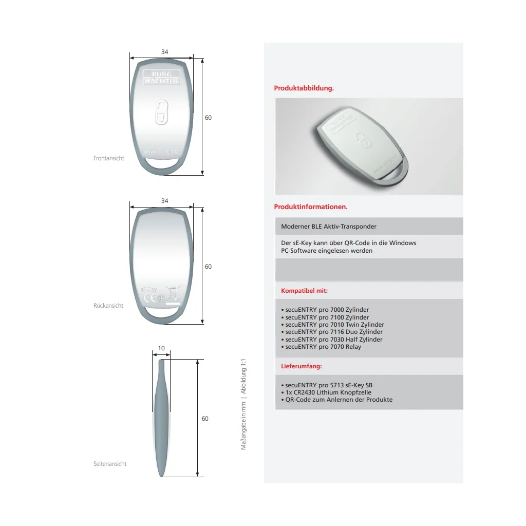 Der Aktiv-Transponder secuENTRY 5713 sE-Key von BURG-WÄCHTER ist eine innovative Lösung, die alle Türzylinder der secuENTRY-Reihe öffnet. Er bietet eine praktische und sichere Alternative zu herkömmlichen Schlüsseln und erhöht die Sicherheit Ihres Zuhauses oder Büros.