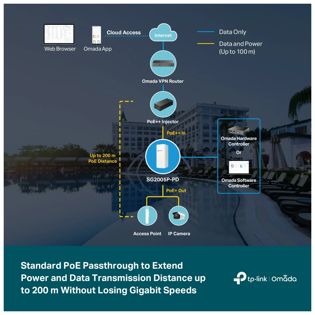 Der TP-Link Omada SG2005P-PD ist ein innovativer 5-Port Gigabit Access-Switch, der selbst über PoE (802.3bt oder at) mit Strom versorgt wird – und gleichzeitig bis zu 3 Geräte über PoE weiterversorgen kann.