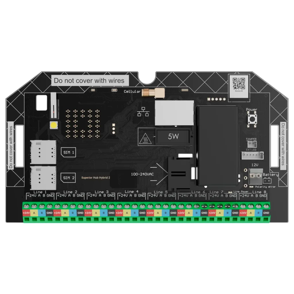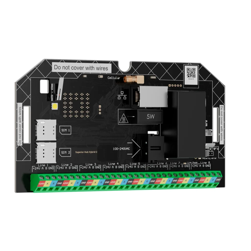 Die Variante Superior Hub Hybrid 2 Without Casing richtet sich an professionelle Installateure und Systemintegratoren, die den Hub in eigenen Gehäusen, 19"-Racks, Schaltschränken oder kundenspezifischen Technikmodulen integrieren möchten. Die Elektronik entspricht vollständig der Grade-3-Norm und bietet dieselbe Leistungsfähigkeit wie die Standardversion – jedoch ohne werkseitiges Kunststoffgehäuse.